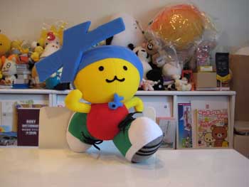「ち」の文字を頭にかぶって、走っているポーズがとてもキュートな「ちょうない君」です。首には「よ」の文字も見えますね。文字をぬいぐるみで製作するのは案外難しいものなのです。また、一応、この形で自立するように製作いたしました!