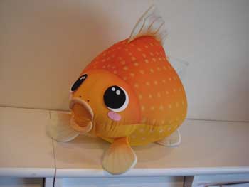 金魚の餌の大手メーカーキョーリンさんの今年のキャンペーンぬいぐるみ「ぴんぽんぱーる」です。尻尾の先まで入れますと、60cmにもなります。お店の店頭などにも飾られていますので、ぜひご覧ください! このぬいぐるみは、グラデーション表現をしています!その制作方法はヒミツ!って程でもありませんが、ぬいぐるみでは通常は使用しないプリント方法でプリントしております。 グラデなどが必要なものに関しても、ぜひ当社にお問い合わせください!