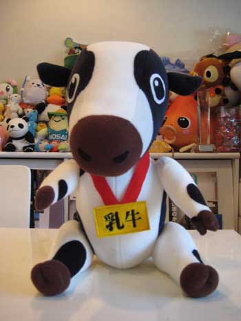 乳牛のぬいぐるみです。手には稲穂を持たせるようにアタッチメントが付いています!他の種類の牛も製作しました!