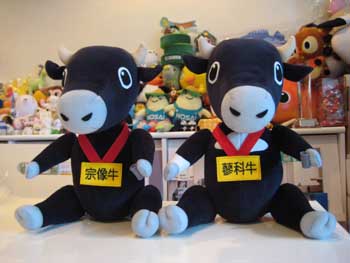 「宗像牛」と「蓼科牛」のぬいぐるみです。さて問題です。何処がどう違うでしょう。